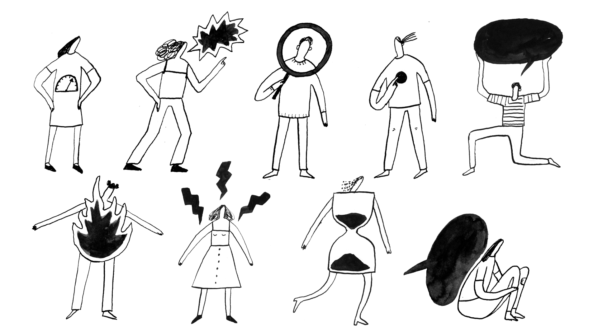 A series of characters for an article about behavioral patterns and how to break them. How do you stop things from pushing your buttons again and again?